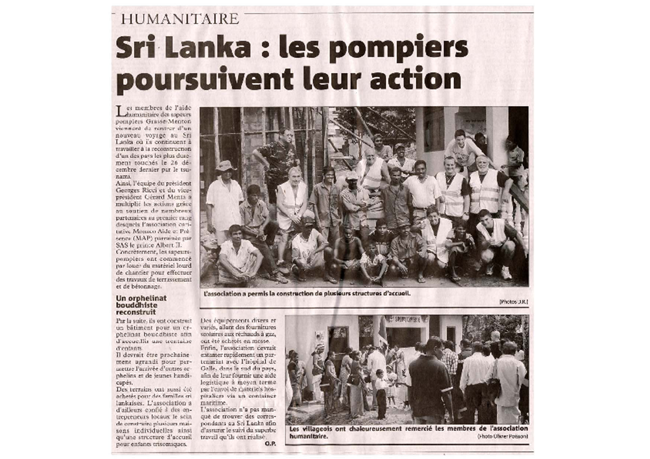 Monaco Aide et Présence a envoyé 10 000 euros pour l’aide d’urgence alimentaire et médicaments. 11 000 euros pour la reconstruction d’une maison pour personnes âgées et la réhabilitation d’une autre. 62 100 euros pour l’achat des 15 bateaux de pêcheurs à moteur et 10 canoës ; 5 000 euros en achat de billets d’avion pour le déplacement de 10 pompiers pour la reconstruction sur l’île et 9 000 euros pour la reconstruction d’une école à Galle ; soit un total de97 100 euros sur 186,307,86 euros recueillis.